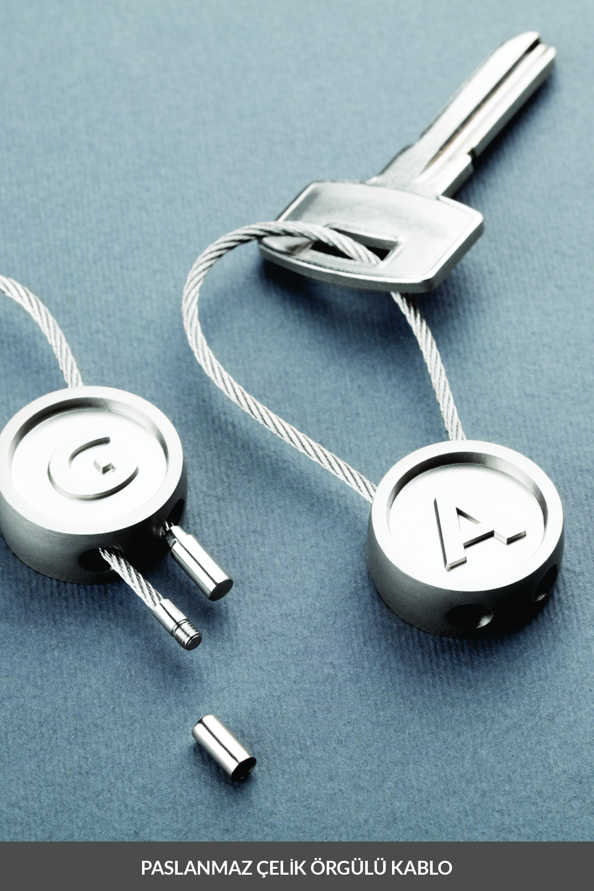 The application of RÖYHKEÄ is very simple. Just remove the steel cable with a little pressure and by opening the nut, connect the keys and any item that can be connected to the keychain by passing them through the cable.